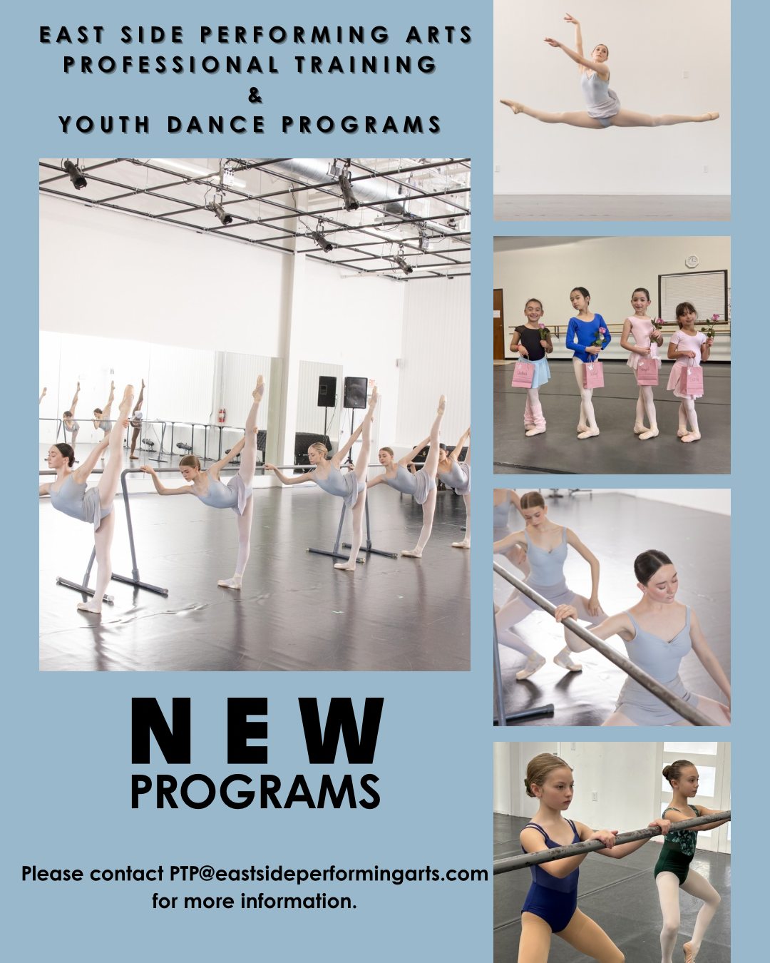 East Side Performing Arts Professional Training Program offers accredited dance education, community and international training and performance opportunities, as well as mentorship for dancers to prepare for all aspects of a professional and/or collegiate career. Dancers in the East Side Performing Arts Professional Training Program have the unique opportunity to not only train with an internationally renowned professional faculty, but also gain vital professional experience while performing with the resident companies of ESPA.